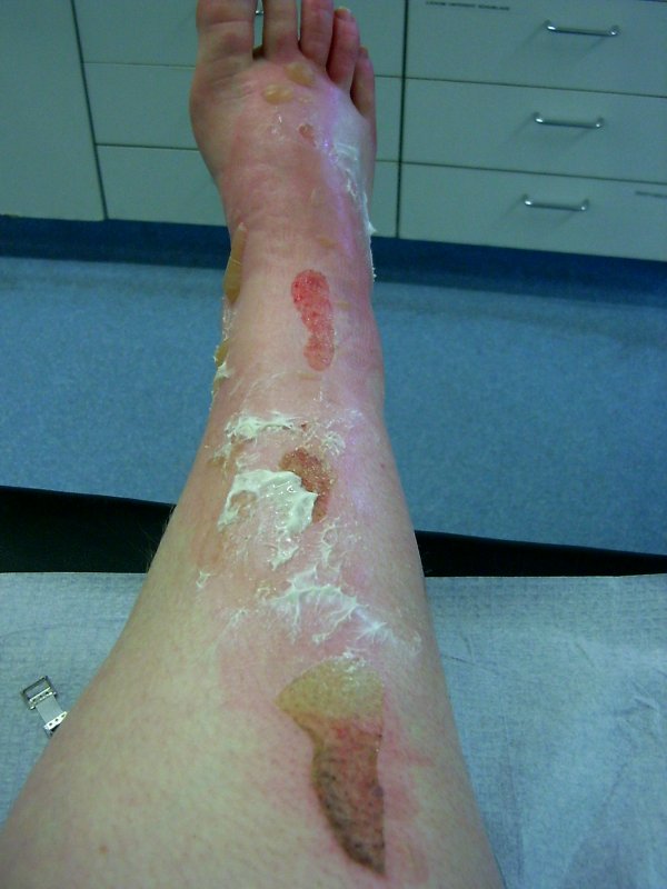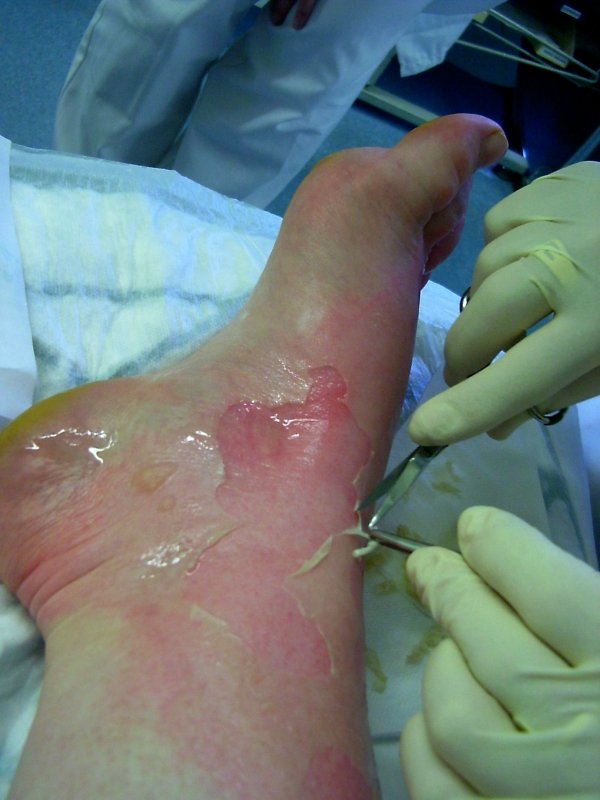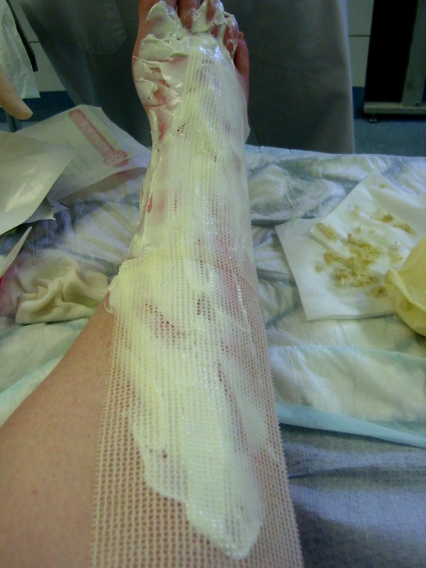 Krankenhaus. Verbruehung 2. Grades, grossflaechig. Beinahe gekotzt vor Schmerz. Oft geheult, dabei mach ich das sonst selten und schon gar nicht vor fremden Leuten, aber auch viel gelacht. Anerkennende Pfiffe der Krankenschwestern. Bei lebendigem Leib die Haut vom Leibe gezogen bekommen (mit Pinzetten!). Als Anschauungsobjekt verdient gemacht. Pfleger Ulli, Schwester Anja. Jemand sang "Weine nicht, wenn dein Fuss dir brennt – Dam dam, Dam dam…". Mit Schmerzmittel vollgepumpt worden. Harry-Potter-Fan, aber nett, die Aerztin. "Daheim weiterkuehlen. Haben Sie Kuehlbeutel?" – "Noe." – "Eiswuerfel?" – "Nein. Aber Tiefkuehlgemuese." – "Perfekt.". Stylische schwarze Kruecken. Zwei Spritzen, einmal Tropfen, einmal Tablette. Morgen wiederkommen.